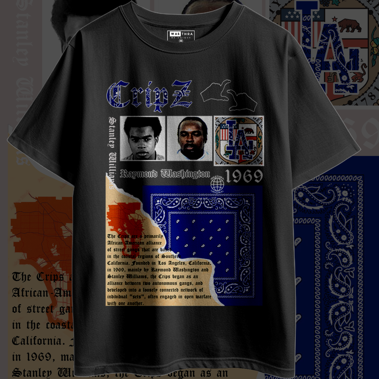 Crips-inspired T-shirt featuring bold blue designs, gang symbols, and iconic hand signs. Made for style, loyalty, and respect.